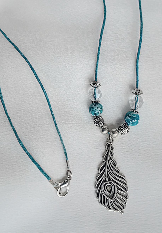Collier pendentif plume en zinc perles en verre et acier inoxydable, cordon en coton bleu de 64 cm